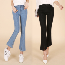 2017春夏牛仔裤女喇叭裤开叉九分休闲裤弹力显瘦宽脚气质女裤子