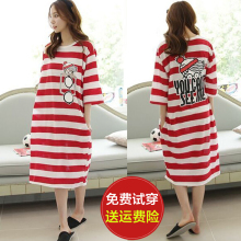 韩国夏季纯棉卡通休闲黑白粗条纹连衣裙女宽松中袖海边度假长裙潮