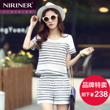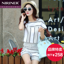 欧洲站2016夏季夏季时尚套装条纹欧根纱上衣修身短裤两件套装女装
