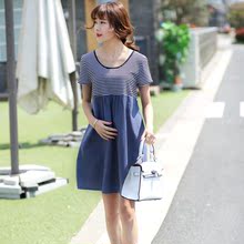 新款孕妇夏装连衣裙短袖中长款韩版孕妇上衣条纹T恤A字2017棉宽松
