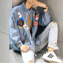 春季韩国ulzzang宽松版牛仔外套BF风原宿男女情侣贴布复古夹克潮