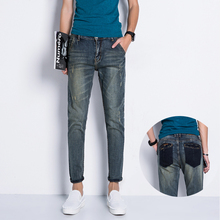 2017春款 牛仔裤男小脚韩版潮流修身型青少年弹力拼接印字长裤子