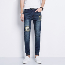 2017春青少年破洞补丁牛仔裤修身小脚裤弹力潮牌个性帅气显瘦男裤