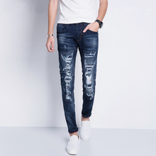 2017春新品青年破洞牛仔裤个性弹力修身小脚裤潮流蓝色紧身长裤