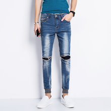 2017夏季 青少膝盖破洞九分牛仔裤小脚裤潮男生9分裤个性