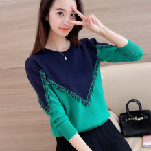羽芙尼2016秋冬新款毛衣女流苏拼色圆领针织衫长袖套头宽松打底衫