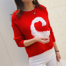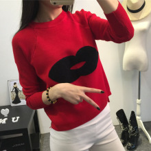 2016秋季新款针织衫女套头宽松长袖红色字母提花短款毛衣女打底衫