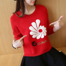 2016秋冬新款套头毛衣女宽松长袖刺绣圆领针织衫短款加厚打底衫