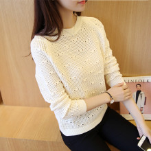 2017春装新款韩版毛衣女宽松打底衫纯色圆领长袖镂空针织衫套头