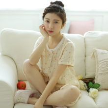 抹茶小蓝睡衣女夏季纯棉纱布薄款水玉点点短袖七分裤家居服套装