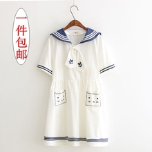 2016夏季新款女装可爱萌系猫咪口袋刺绣海军领森女系短袖连衣裙R3