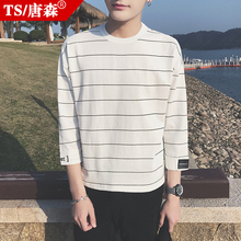 唐森2017夏季新款七分袖T恤男士纯色条纹修身t恤小清新潮男上衣服