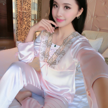 夏季女士丝绸空调睡衣长袖春秋季两件套装可爱刺绣丝质家居服薄款