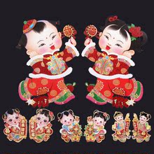 卡通金童玉女新年贴画 鸡年装饰门贴墙贴一对装 过年春节生肖贴纸