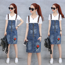 2017新款夏季中长款牛仔背带裙宽松显瘦a字吊带玫瑰绣花裙女装潮