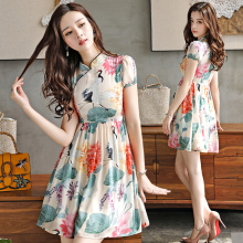 2017夏装新款女修身显瘦复古印花短袖高腰a字改良旗袍连衣裙潮