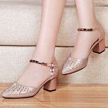 夏季粗跟包头凉鞋女夏中跟尖头单鞋浅口女式包跟水钻网纱镂空女鞋