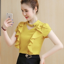 2017夏季新款遮肚子木耳边雪纺衫V领短袖百搭上衣荷叶雪纺衬衫女