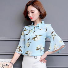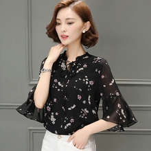 夏装2017新款女短袖雪纺衬衫荷叶边上衣遮肚子雪纺衫喇叭袖小衫潮