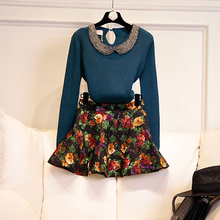 2016秋冬新品女装气质复古花色毛衣短裙两件套套装裙子连衣裙