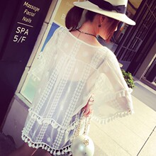 防晒衣女 中长款 百搭 学生 bf2017夏新款宽松流苏短袖开衫雪纺衫