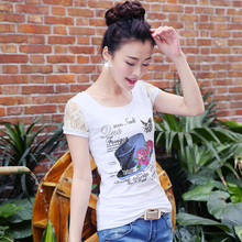 2017夏季新款蕾丝短袖T恤女韩版夏天修身衣服女士体恤印花上衣潮