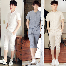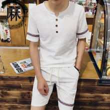 2017春夏季新款短袖长裤套装 男青年大码亚麻棉麻两件套韩版潮流