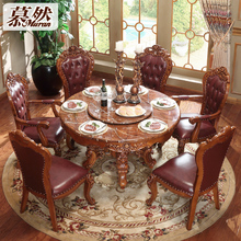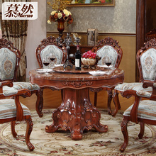 欧式餐桌 实木圆餐桌牡丹雕花餐台 带转盘饭桌子 美式大理石家具