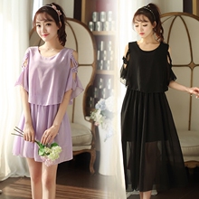 实拍夏季短裙修身显瘦露肩复古假两件大码雪纺短袖连衣裙长7721#