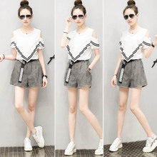 欧洲站2017夏季新款女装韩版露肩T恤+格子短裤两件套时尚套装女潮