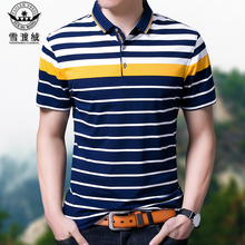 夏装潮款中年男士短袖t恤条纹带领冰丝光棉丅血体恤桖半袖爸爸装