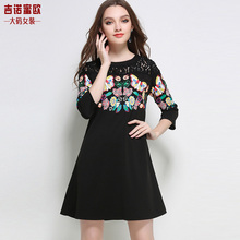 欧美大码女装胖MM春夏新款2017蕾丝拼接时尚印花七分袖显瘦连衣裙
