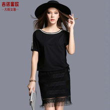 胖妹妹女2017夏装新款欧美大码女装胖mm连衣裙短袖假两件流苏裙潮