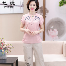弋婕2017新款夏装中老年休闲棉麻套装宽松大码短袖T恤+阔腿裤