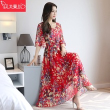 雪纺连衣裙夏新款气质修身波西米亚度假裙印花沙滩裙大摆飘逸长裙