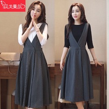 2017春夏新款七分袖背带裙套装 时尚两件套中长款减龄连衣裙女