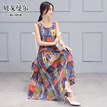 2017夏装新品雪纺沙滩裙女 无袖背心真丝裙子 修身复古印花连衣裙