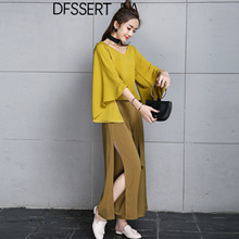 唐汇雪纺5分喇叭袖侧开叉阔腿裤套装2017春秋薄款时尚女装两件套