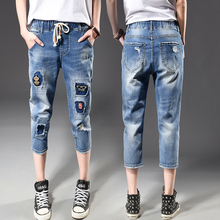 松紧腰牛仔裤女 哈伦裤2017夏季薄款宽松大码卷边裤脚 破洞七分裤