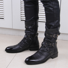 尖头新款英伦高筒内增高靴子韩版时尚潮流男士皮靴马丁靴透气