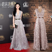 2017新款明星同款礼服银色深V晚礼服女宴会长款修身主持人演出服