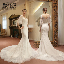 婚纱礼服2017新款一字肩抹胸鱼尾婚纱韩式中袖长拖尾简约新娘结婚