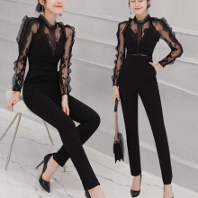 网纱性感透视连体裤春夏女装2017新款立领长袖显瘦小脚长款连衣裤