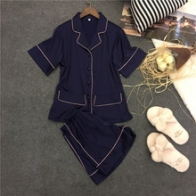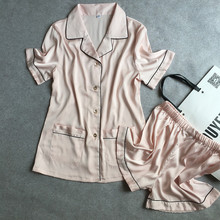 17年夏季短袖短裤睡衣女 学生甜美可爱休闲衬衫领真丝家居服套装