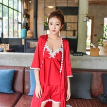 新品夏季真丝睡衣女款短袖短裤三件套胸垫性感吊带冰丝家居服套装
