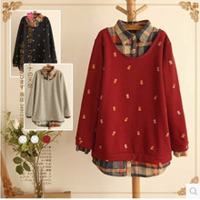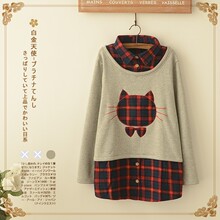 【天天特价】森女系加绒卫衣甜美大码可爱格子猫头假两件打底衫