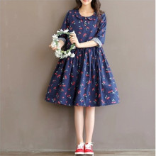 大码女装甜美气质小清新森女系宽松翻领波点裙显瘦棉麻长袖连衣裙