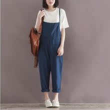 大码女装夏装2016新款森女系显瘦背带裤亚麻宽松哈伦吊带裤九分裤