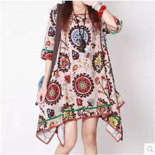 大码女装胖mm夏2015 韩版新款时尚宽松显瘦不规则棉麻短袖连衣裙