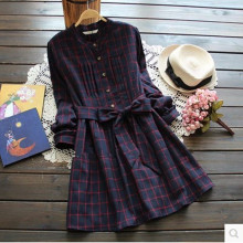 【天天特价】女衬衫裙森女系大码宽松文艺百搭格子棉麻长袖连衣裙